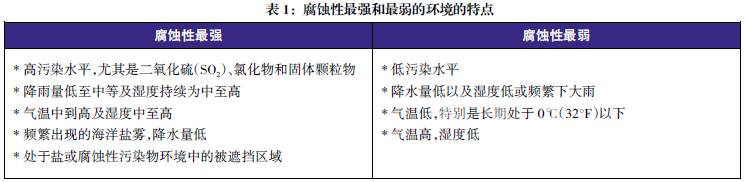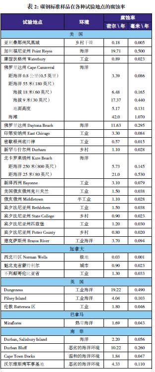 世界各地都進(jìn)行過各種應(yīng)用環(huán)境下的金屬腐蝕性能比較試驗。以碳鋼為標(biāo)準(zhǔn)樣品對這些試驗地點的腐蝕性進(jìn)行了比較。表2給出了標(biāo)準(zhǔn)樣品在北美試驗地點的腐蝕率數(shù)據(jù)。盡管某些地點處于經(jīng)常使用除冰鹽的地區(qū),但樣品并未暴露于除冰鹽之下。
