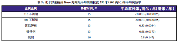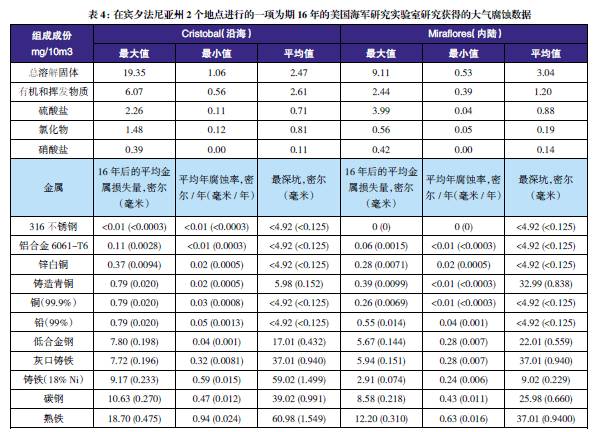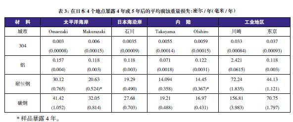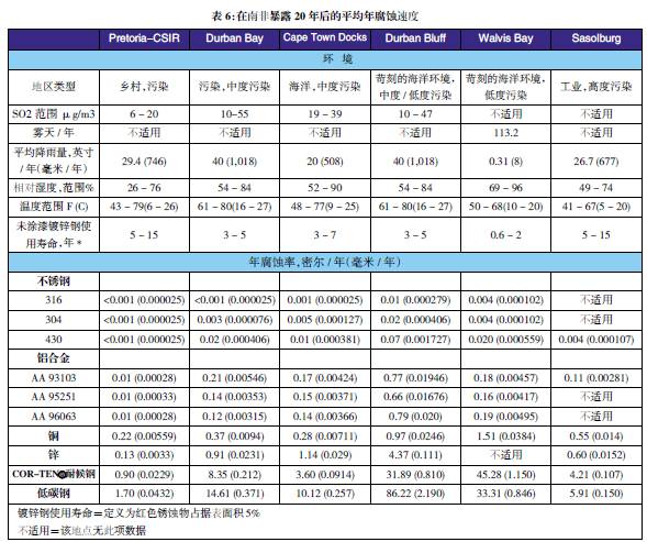 表3至表6的數(shù)據(jù)來自于日本、巴拿馬、Kure 海灘(北卡萊羅納州)和南非的試驗地點??衫眠@些數(shù)據(jù)在類似環(huán)境中選擇適當(dāng)?shù)慕饘俨牧?,進(jìn)行生命周期成本分析。